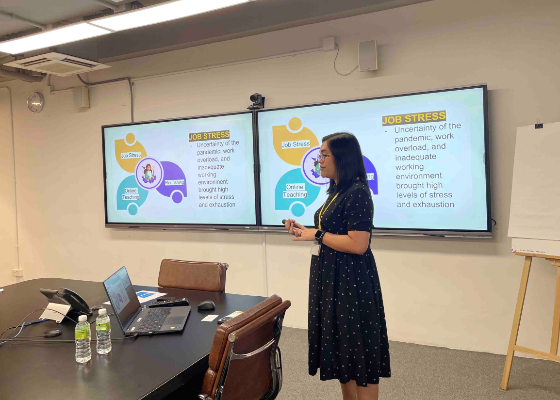 首场环节由Prof. Merimee T. Siena主讲,介绍一项已完成的研究,探讨新冠疫情期间影响菲律宾教师幸福感的各项工作相关因素。该研究采用汇聚并行混合方法设计,探讨心理工作压力及教师对网上教学的态度如何影响其幸福感。研究结果展示了教师如何在危机情况下应对专业要求,同时维持心理健康。